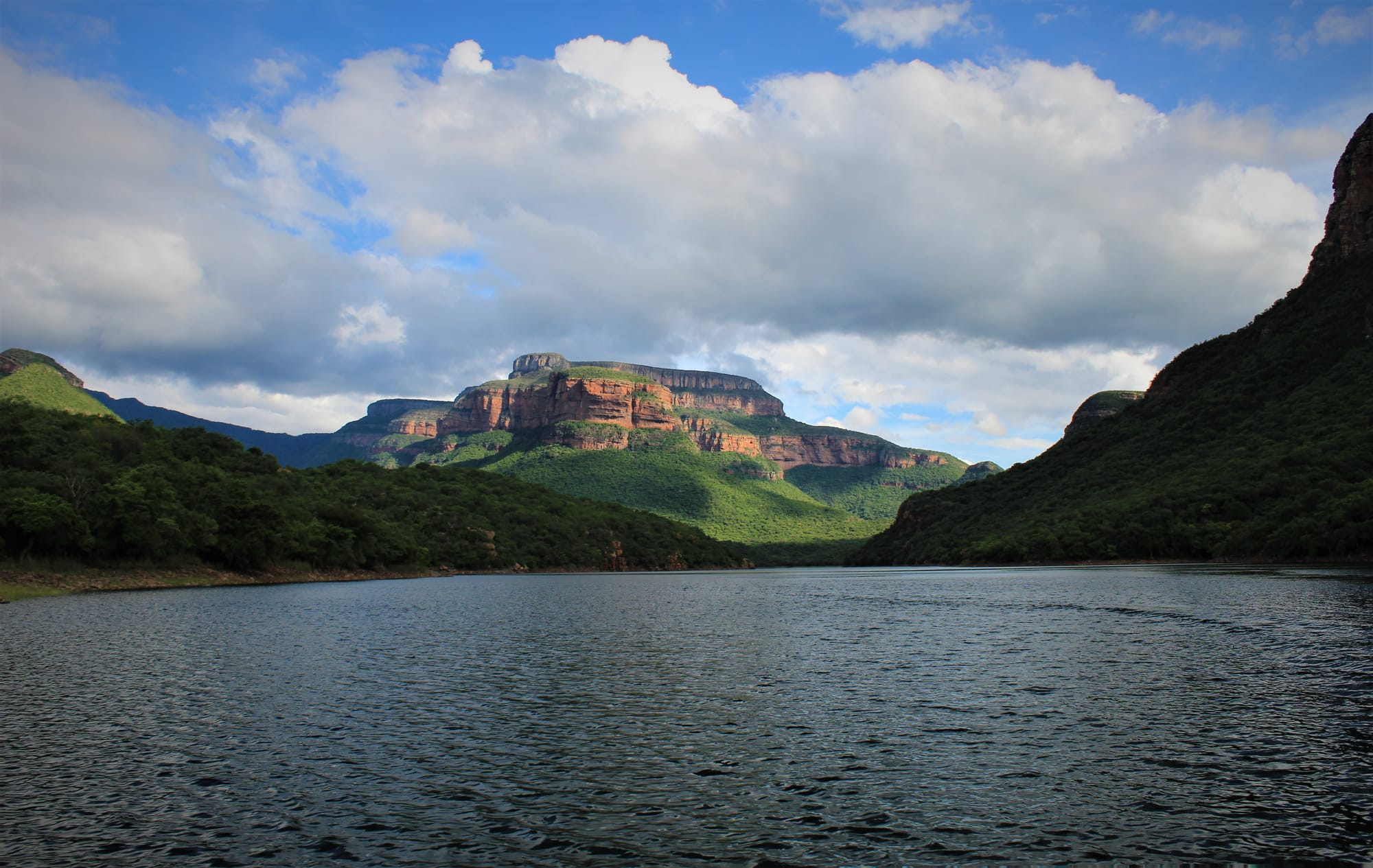 From the water, the escarpment reveals itself in layers, with the higher reaches of the Drakensberg rising softly rather than dramatically. This is a landscape that rewards attention rather than urgency.