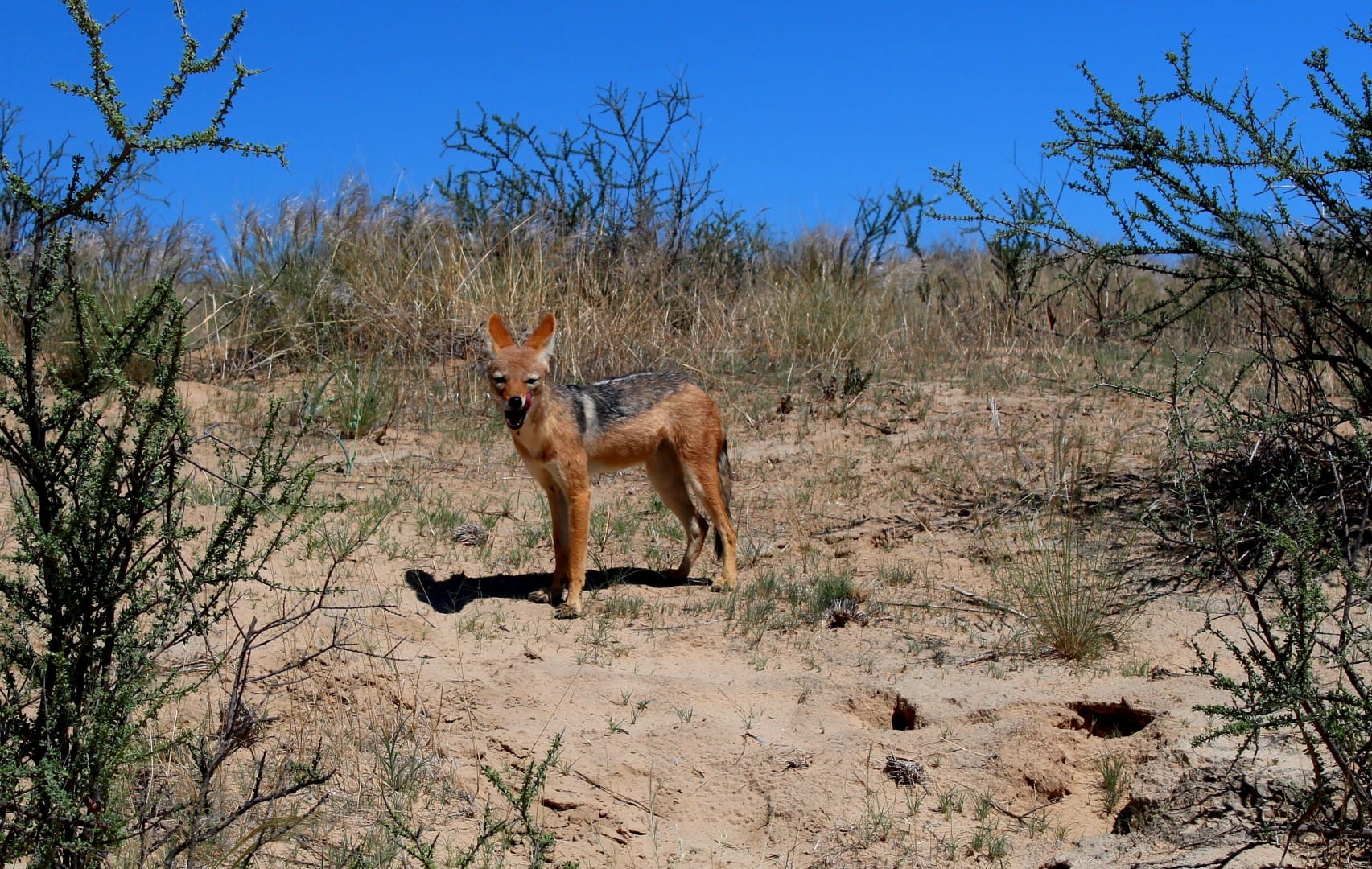 Out on the Kgalagadi Transfrontier Park’s red dunes, patience and precision define the drama of the desert. The black-backed jackal, often seen trotting in pairs, exemplifies cooperation. They hunt together and share food, a partnership born of harsh necessity. Their calls echo at dusk, a duet of haunting yelps that claim territory and affirm loyalty.