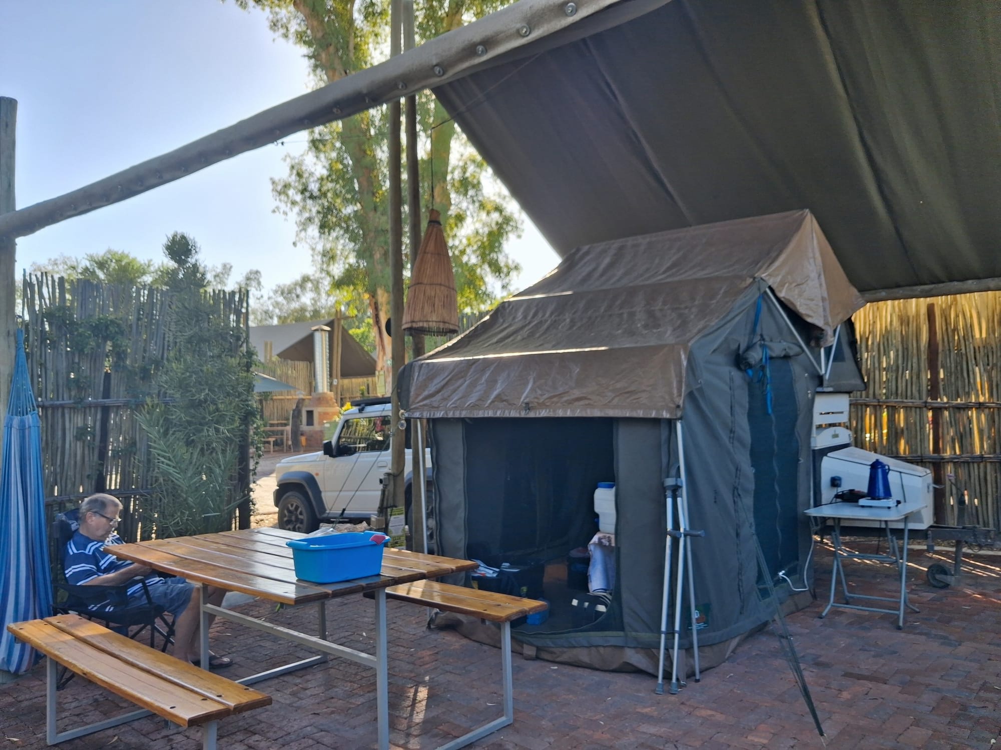 “On Christmas Day, we tackled the long stretch to the Huab Lodge and Bush Spa, where my school friend Deon Brummer and his wife Lidia live. On their recommendation, we stayed on tar roads and drove through the most beautiful towns, including Usakos, Karibib, Okahandja, Otjiwarongo, and Outjo. At Khorixas, the road turned to gravel again for the final stretch via Fransfontein to Huab.